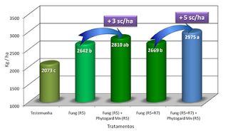 Fancelli et al². (2005) demonstrou a possibilidade da redução da incidência e severidade da ferrugem asiática da soja, mediante a aplicação foliar conjunta de Mn e Cu, nos estádios V5 e R1 da soja, antes da constatação da mencionada doença. Os resultados obtidos levaram a um incremento de 20% na produtividade. Justificando tal resultado, têm-se os papéis de cada um destes nutrientes na planta, sendo que o Mn, além de apresentar papel relevante na fotossíntese, atua no sistema enzimático e na síntese de fitoalexinas, favorece a maturação das plantas, participa na síntese de proteínas e também reduz os efeitos de fotossensibilização provocada por radiação intensa, sem contar com sua participação no processo de divisão celular. Enquanto que o Cu participa na fotossíntese, no metabolismo de compostos de defesa como fenóis e quinonas, além de, juntamente com o Mn, ter um papel fundamental na síntese de lignina, a qual funciona como uma barreira contra a penetração de patógenos, bem como atua nas enzimas que inativam os oxidiantes deletérios.