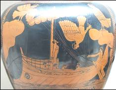 A cena pintada referenciando as sereias da qual são vistas metade peixes e metade pássaros eram consideradas “Demônios marinhos em parte mulheres em pássaros […]” (KURY, 2003, p. 374). O que está visível é que estão entrando em uma caverna ou aproximando-se de uma ilha. Odisseu advertiu os seus que o amarrassem e logo depois cada um tampasse seus ouvidos e assim foi feito.