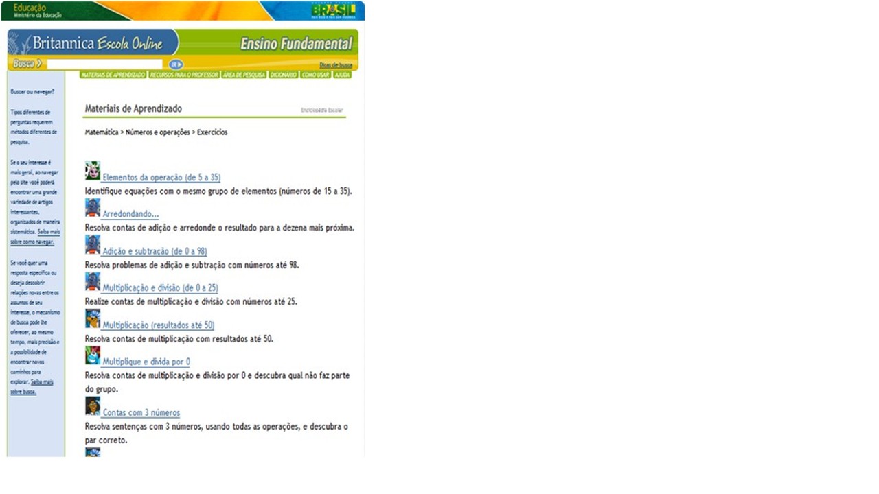 São estas respostas que fomentam na criança a raciocínio lógico, especificamente no ensino da matemática, quando o e a educanda se depara com os graus de dificuldades de cada jogo. É neste sentido que este estudo buscou desenvolver ações voltadas aos conteúdos matemáticos com o uso de ferramentas tecnológicas educacionais – no caso o sitio da Britannica Escola Online, com o intuito de compreender como ocorre o processo de construção do conhecimento lógico matemático em contraposição aos métodos tracionais utilizados neste mesmo processo. Sendo assim, o uso do ambiente virtual Britannica Escola Online é suscetível a evolução de certas metodologias, pois abrange de uma maneira simples e eficaz o auxilio ao ensino da matemática, bem como de áreas da educação básica.