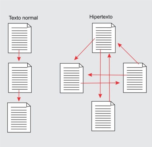 Um conjunto de nós ligados por conexões. Os nós podem ser palavras, páginas, imagens, gráficos ou parte de gráficos, sequências sonoras, documentos complexos que podem ser eles mesmos hipertextos. Os itens de informação não são ligados linearmente, como uma corda com nós, mas cada um deles, ou a maioria deles, estende suas conexões em estrela, de modo reticular.