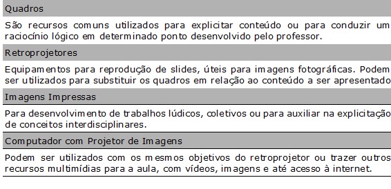 Esses recursos utilizados são chamados de recursos didáticos. “Recurso didático é todo material utilizado como auxílio no ensino-aprendizagem do conteúdo proposto para ser aplicado pelo professor a seus alunos”. (SOUZA, 2007, p 111)