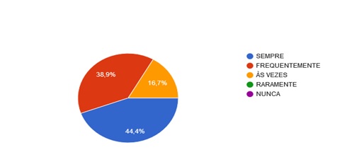 O recurso didático mais utilizado é o datashow pois com relação aos 100% dos entrevistados que afirmaram que utilizam, 44,4% sempre utilizam, 38,95 utilizam com frequência e 16,7% utilizam às vezes.