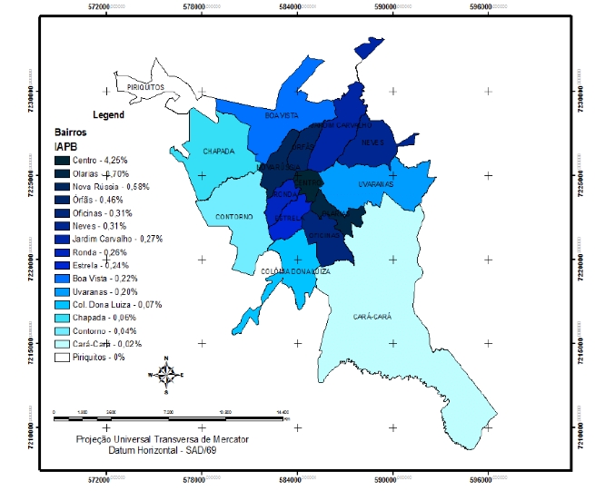 A partir da figura 2 pode-se perceber que em extensão o bairro Cará – Cará é o maior dentro do município. Quanto a população o censo do IBGE (2010) mostra que o bairro fica em terceiro lugar com 27.779 habitantes, perdendo apenas para os bairros Contorno e Uvaranas.