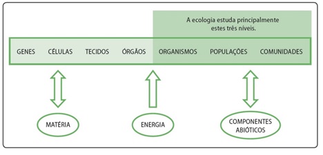 A Ecologia estuda os organismos e suas inter-relações com o ambiente em que está inserido e interagindo, onde produz fluxo de energia e ocorre ciclagem de materiais entre partes vivas e não-vivas (ODUM, 2007). Abrange a dinâmica de organismos para formar populações e comunidades, que seu nível mais amplo, tem-se o seu objeto de estudo, o ecossistema, relacionado ao planeta Terra, a chamada Biosfera.