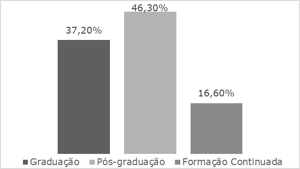 Dentre os respondentes que já tiveram experiência com cursos na modalidade EaD, observou-se que 46,3%, a maioria, fez curso no nível de pós-graduação. Em proporção não muito distante, 37,2% fizeram graduação. Os cursos de formação continuada, conforme é observado na Figura 2, têm uma frequência menor entre os níveis investigados, apenas 16,6% das respostas. O resultado condiz com o que se aprensenta no censo EAD.BR 2017 em que os cursos de especialização (pós-graduação) são maioria (ABED).