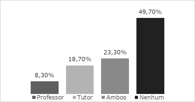 Quanto ao papel do professor/tutor, entre os fatores motivadores percebe-se que o professor formador (8,3%) obtém o menor índice como elemento motivador para permanência ou conclusão do curso. Sendo a resposta, Nenhum, como maior índice para quase metade dos entrevistados com 49,7%, conforme Figura 5.