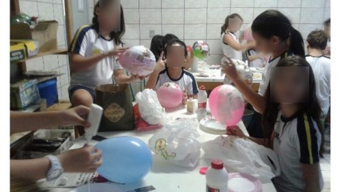 Quando finalizamos o ensaio, confeccionamos as máscaras que seriam utilizadas no baile (Figura 1). Para isso, utilizamos balão, cola branca e pedaços de jornais. Nessa atividade as crianças encheram o balão no formato cada qual de seu rosto, passaram cola branca e colaram 7 camadas de pedaços de jornais. Deixaram secar. Em seguida, estouraram o balão. Depois disso, recortaram no formato de sua escolha e fizeram a arte utilizando tinta guache. Ainda, improvisaram as fantasias com o que já tinham em casa.