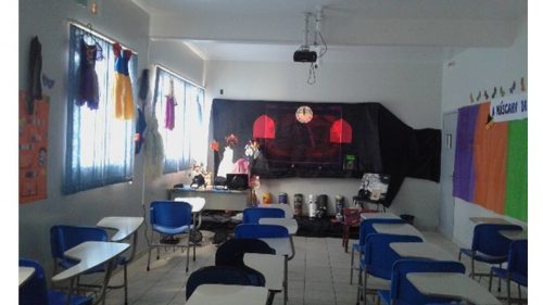 Para o cenário da peça, fizemos uma vaquinha e compramos os tecidos que compunham as cores do salão do palácio. São elas: preto, vermelho, laranja, verde, violeta, branco e azul. Dispusemos os tecidos ao lado direito da sala, cada um representando um salão da abadia, junto com uma faixa na qual escrevemos o título do conto. Ao lado esquerdo, colocamos algumas fantasias penduradas como decoração do baile. Além disso, dispusemos ao fundo da sala um tecido preto com as vidraças vermelhas, o relógio de ébano e outras peças decorativas que emprestamos da escola (Figura 2). Para a confecção do relógio de ébano e das vidraças, utilizamos EVA e isopor. Ainda, na ponta oposta ao fundo preto, colocamos uma cadeira representando o trono do príncipe. Além disso, para causarmos um ambiente gótico, desligamos as luzes da sala, utilizamos jogo de luzes vermelhas e máquina de fumaça.