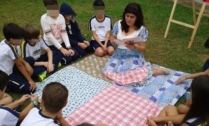 Na primeira imagem, à direita, foi contada a história A Colcha de Retalhos (2010), de Conceil Corrêa da Silva. Esse livro narra a história de Felipe que gostava muito de ir à casa de sua avó. Além dela preparar deliciosos bolos, era uma ótima contadora de histórias. Certa vez, ao costurar uma colcha de retalhos coloridos e cheio de histórias, a avó de Felipe ia costurando lembranças a cada novo retalho. Dessa forma, Felipe conheceu a saudade. Para essa história, utilizamos, como recurso, um vestido e um tapete de retalhos. Além disso, utilizamos a grama como espaço pedagógico. As crianças sentaram em círculo, no chão. Ao final da história, os alunos contaram experiências de seus avós e relembraram histórias que eram contadas por eles. Ainda, como parte dessa atividade, cada aluno pintou em um retalho 30 x 40 uma lembrança de sua história. Os retalhos foram costurados formando uma colcha que passou a ser utilizada como recurso para contação de histórias.