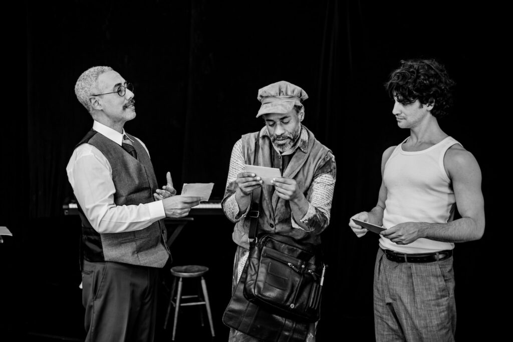No palco, os atores Rodrigo Mercadante, Caio Horowicz e Fábio Neppo dão vida aos personagens Mário de Andrade, Fernando Sabino e ao carteiro, figura central da narrativa. É por meio deste mensageiro que a história se desenrola — conduzindo o público pelas trocas de correspondências entre dois dos mais emblemáticos escritores nacionais do século XX.