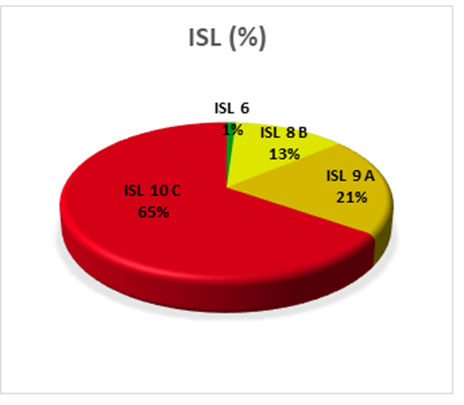 Em síntese, a área aqui estudada tem uma orla fluviomarinha extremamente sensível a possíveis derramamentos de óleos e derivados, com predominância dos índices mais sensíveis (ISL: 6; 8B; 9A e 10C) segundo a metodologia Sousa Filho (2004). A Figura 4 mostra o gráfico do percentual (%) do ISL linear disposta ao longo de toda a área estudada, com destaque para o ISL 10C, prevalecendo em 65% da área.
