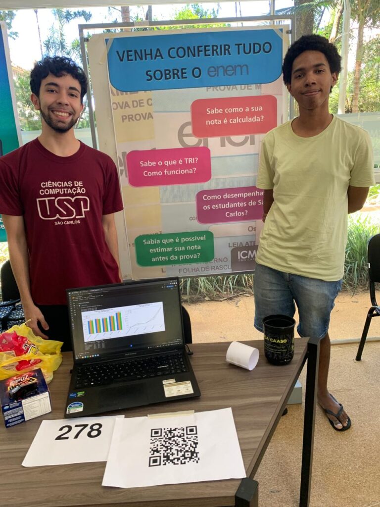 Análise dos Microdados do Enem – Desenvolvido por Fernando Valentim Torres e João Gabriel Pieroli da Silva, o estudo analisou principalmente os microdados de 2024 do Enem, usando também as bases de 2022 e 2023 para comparações históricas. De acordo com os estudantes do curso Ciência da Computação, escolheram o tema por motivações pessoais e técnicas. “Eu ingressei na USP pelo Enem, mas nunca tinha até então desbravado essa base de dados, porque embora ela fosse pública, ela contém realmente muitos dados, que exigem dominar ferramentas de computação”, destaca João Gabriel.