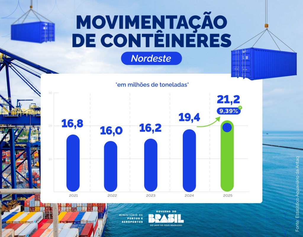 Segundo o ministro de Portos e Aeroportos, Silvio Costa Filho, o Nordeste se tornou uma porta de saída estratégica do Brasil para o mundo no ano passado: “estamos preparando a região para ser um hub logístico eficiente e competitivo internacionalmente”, ressaltou. Um dos indicadores mais expressivos do aperfeiçoamento logístico do setor aquaviário nordestino foi a operação de contêineres, que alcançou um crescimento bastante significativo em 2025: com alta de 9,4%. Os 21,2 milhões de toneladas de contêineres concentram o maior volume registrado desde 2021.