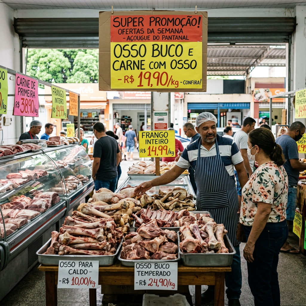 Cuiabá, 2022. Promoção no açougue: carne moída de retalhos, carcaça, picadão suíno. E a grande estrela do momento: ossos – chamados carinhosamente de ossinhos. Perambulo, sob céu de mil sóis, no Centro-Oeste do agrobusiness exportador, após para cá transportado por motivo de (pouco) trabalho de companheira que acompanhei, a vivenciar capítulo estético-existencial da historieta de um Brasil que torna ao tempo do tônus inflacionário, disposto a retomar seu quinhão no mapa da fome.
