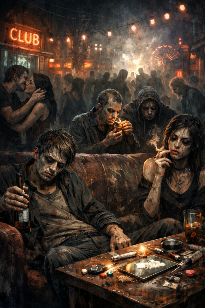 Mas falo dos que levam uma vida vã, meio hedonista, meio alienante e, não raro, muito autodestrutiva, espécie de fuga de problemas que não conseguem resolver, daqueles que os mais fracos de espírito usam drogas e vertigem como rota de fuga de si mesmos.